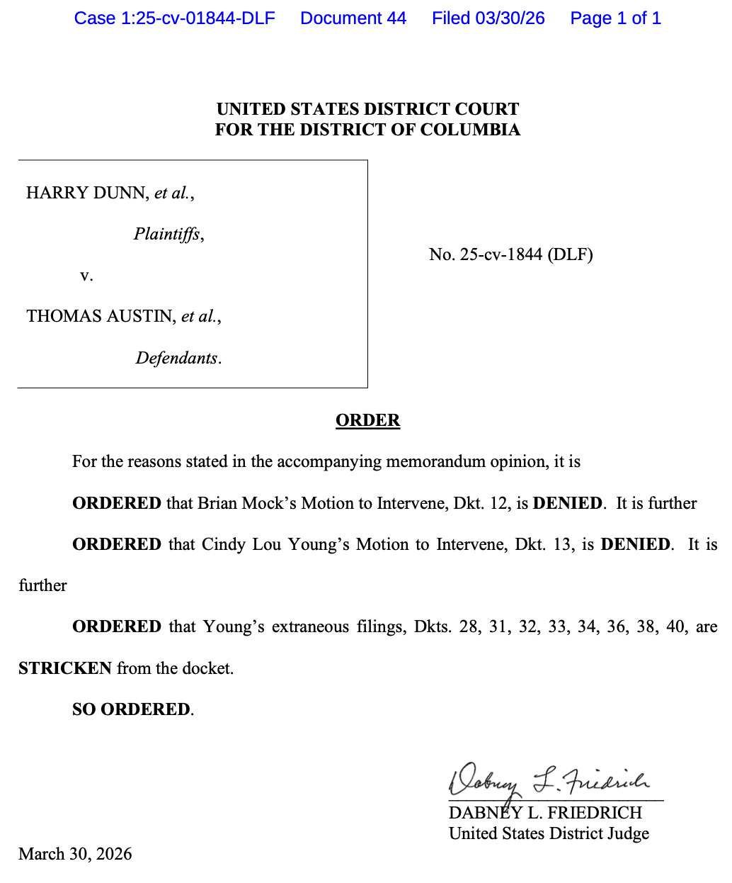 Today, Judge Dabney L. Friedrich, a Trump appointed judge, denied the motions filed by Brian Mock and Cindy Young to intervene in the ongoing case concerning the installation of the January 6 plaque at the U.S. Capitol. The court’s rationale was that neither movant established standing or demonstrated an ongoing injury sufficient to justify intervention. The order went further, striking Young's related filings from the docket