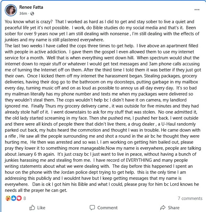 Trying to lead with compassion, Renee shared the Gospel and even allowed the tenants temporary access to her internet service. When that access was removed—after repeated abuse—the harassment intensified.